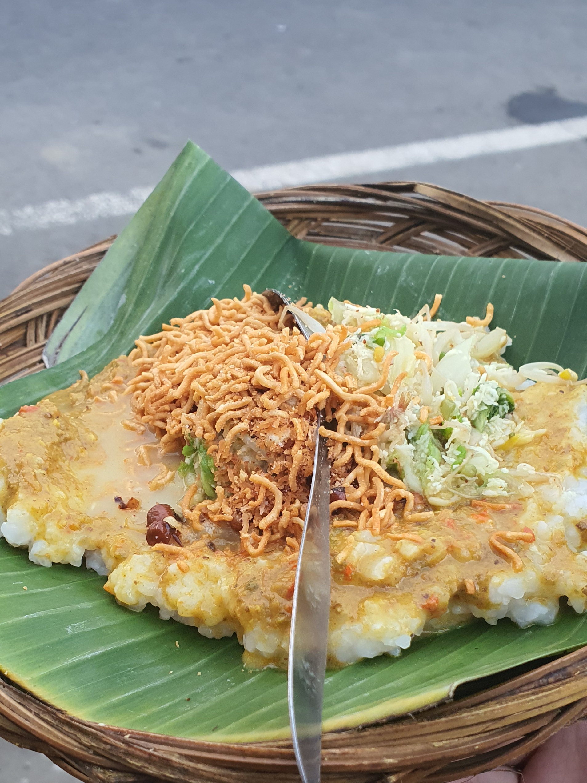 양념된 죽에 야채랑 코코넛으로 만든 소스, 위에 라면땅까지 올려주면 한끼로 든든해서 아침식사로 종종 즐겨 먹습니다.
